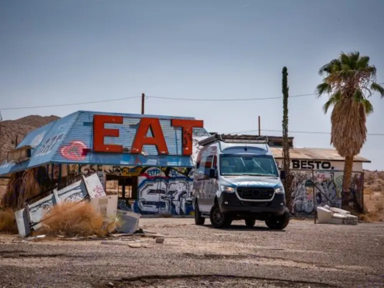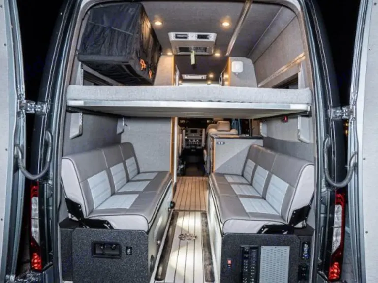With comfortable leather seating throughout the vehicle, you can enjoy the ride or use the detachable table to eat or get work done. When parked, the front driver and passenger seats, as well as the two back seats rotate 180 degrees to face the cabin and join in on the fun behind. When it's time to get some rest, there are two queen sized beds in the back. There is a “honey bunny bed” which is a queen size bed, and can simply be assembled on the bolted racks attached to the side walls above the bench seats in the back. The benches in the back fold into a full queen size bed as well.