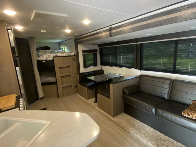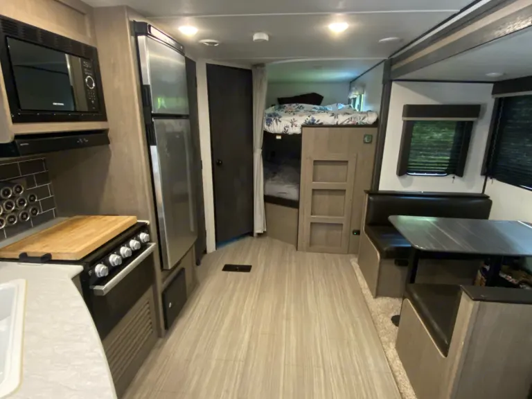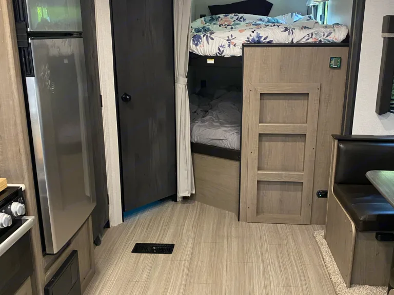 Bunkhouse Layout: Ample sleeping space for the family with bunk beds and a convertible dinette, ensuring everyone's comfort.