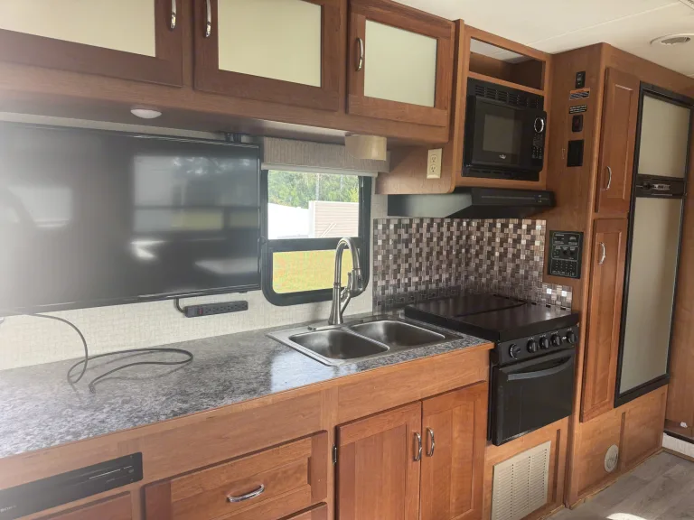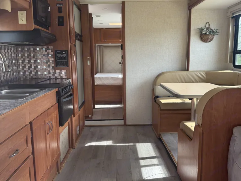 This RV boasts a Queen bed in the back, a loft bunk, 2 recliners, and a table that converts to a bed if needed. The awning extends for shade while you relax on your vacation. You can even bring your fur baby.