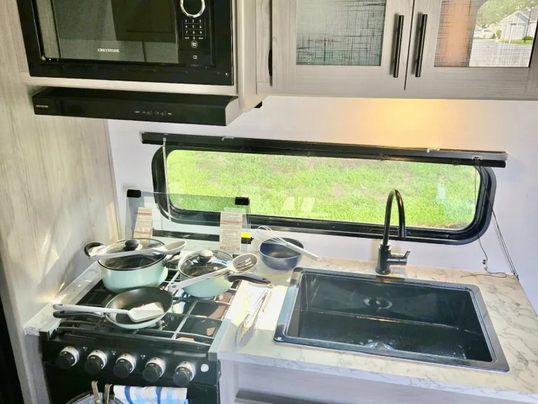 What's includedCamp chairs (4), pop up tent, toilet paper, trash bags, outdoor rug, Keurig, ice maker, stocked kitchen (pots, pans, cutlery, plates, cups, bowls, etc).