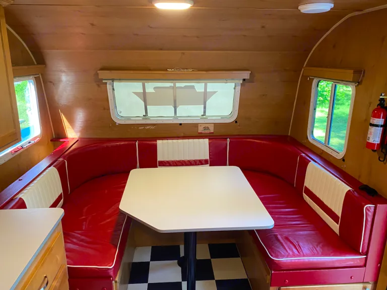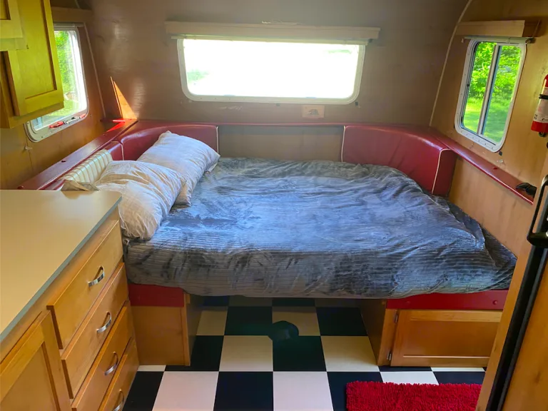 Big Red is lightweight 19 foot "retro" travel trailer that has it all! From its iconic look to its functionality, this trailer is perfect for a family or couples getaway. Its small size is perfect to move around and park in places that few travel trailers can venture. With a bunk bed and large U shaped dinette that converts to a king size bed, there is plenty of room to get a great nights rest. For your cooking needs, the trailer comes equipped with a two burner gas cook top and microwave as well as a propane portable Colman grill. Also, Big Red is fully stocked with pots, pans, plates, dishes, and cutlery for any of your cooking and dining needs. With AC and heat, and two ceiling fans, you will always be comfortable regardless of what nature throws your way.The bathroom in Big Red has a large vanity and plenty of storage. With that said, Big Red has an outdoor shower with custom made teak shower floor to stand on. You will also have a pop up enclosure should you need more privacy. What's includedDelivery, and set up, within 150 miles. Big Red is only available for delivery.Trailer Extras: