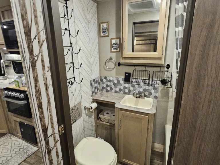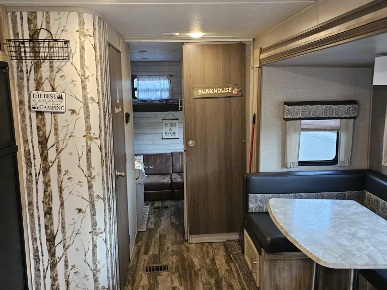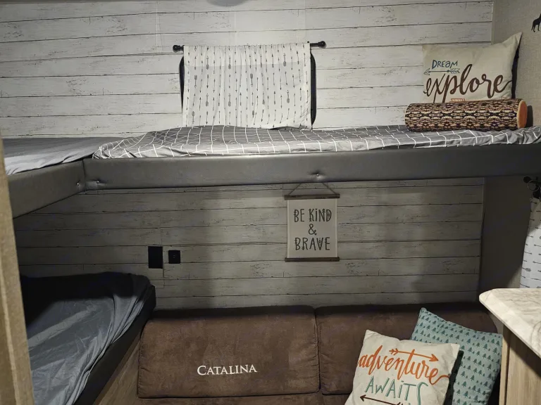 This trailer has 1 slide out, 1 entrance and 2 separate bedrooms . The trailer has a separate master suite, for when you need some alone time! In this bedroom you will find a Queen size memory foam bed, USB charging docks a TV and Roku. It also has plenty of storage with 2 closets and over and under the bed storage. Your kids and teens will love the separate bunk house! It has 3 twin bunks, and a pull out couch, reading lights , USB chargers, a flat screen TV and wardrobe.