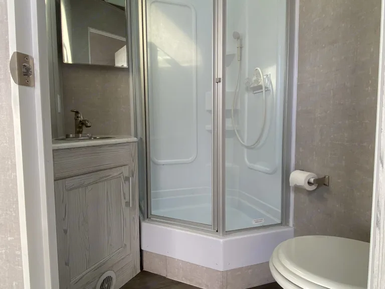 3 queen size beds, comfortably sleeps 6. One private bedroom with additional storage. Full size bathroom with sink, porcelain toilet and shower. Kitchen area has nice large farmhouse sink. 3 burner stove, oven, microwave and mid-size fridge.