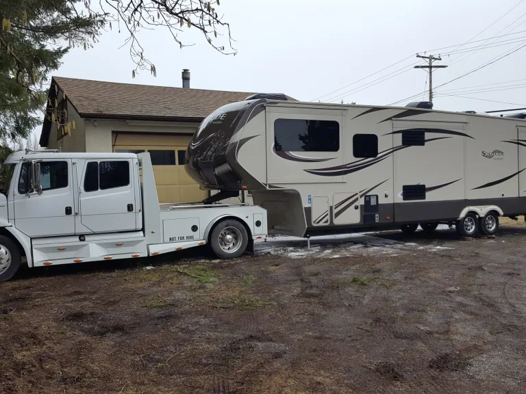 This fifth wheel is one of the nicest floor layout going with a very bright homey feel to it with a big open living room in the forward end of the trailer and kitchen dinning room in the middle and bathroom and large roomy bedroom in the is makes it very comfortable queen bed in the bed room and two pullout queens in the living room.