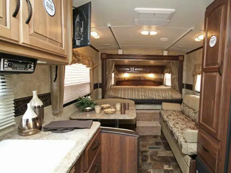 The back has a hard pop out for a king bed. The table and couch both convert to beds. The back of the trailer has a ramp for toys,a fold down murphy bed and privacy door to the rest of trailer. The bathroom has a shower tub combo with a skylight for taller people. The outside awning is 21 feet has an outside cook station. Overall, It is very easy to tow and light( weighs 5500 lbs)