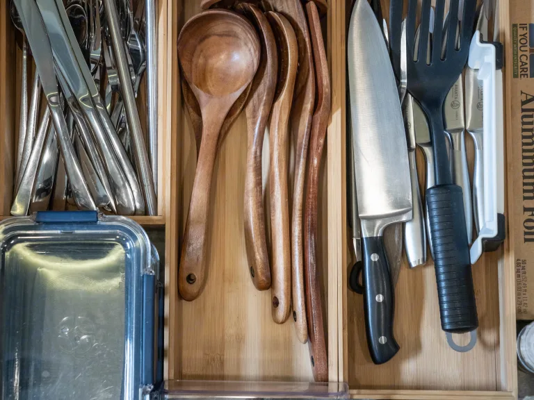 • Teak wooden utensils - salad spoon, salad fork, serving spoon, skimmer, spatula, turner, ladle, pasta server, and a slotted turner