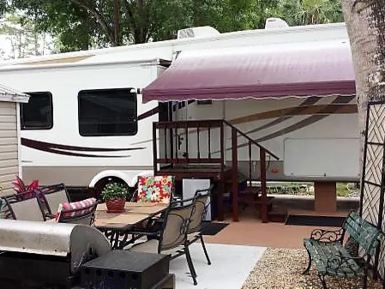 The RV is a fifth wheel with four slides. It is huge inside with a king bed, washer and dryer, and large four door Refrigerator. It has WiFi, a surround sound entertainment center with large (44 inch?) TV, cable TV, and Netflix streaming service. There is a TV in the bedroom and a printer in the entertainment center. The RV is permanently sitting on an large site and is located in a beautifully landscaped RV park with a heated pool; pickle ball courts, bocci courts; and shuffleboard courts. There are activities in the park The park provides everything needed to play.
