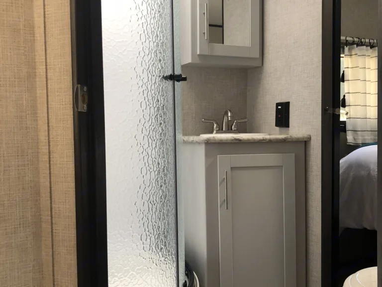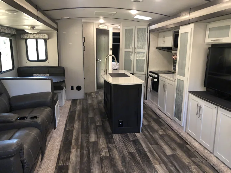 Travel in luxury in our fully stocked, top of the line travel trailer offering modern interior/exterior design.Our travel trailer comfortably sleeps up to 6 people and offers a custom king bed in the bedroom with a temper pedic mattress cover. The leather sofa pulls out into a double bed as does the dinette.There’s two slide outs allowing for ample room to spread out while you enjoy watching TV on our 40 inch LED TV equipped with DVD player.