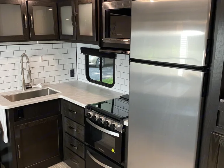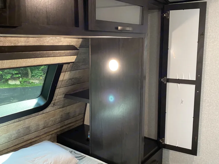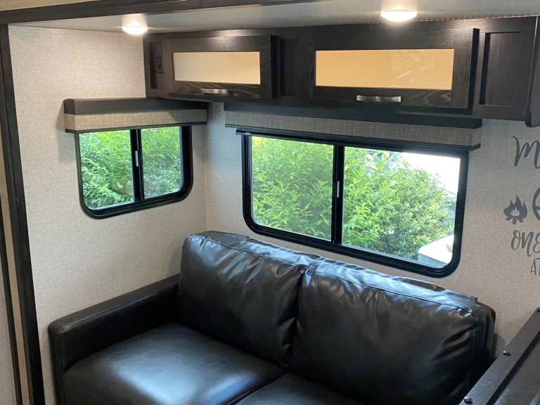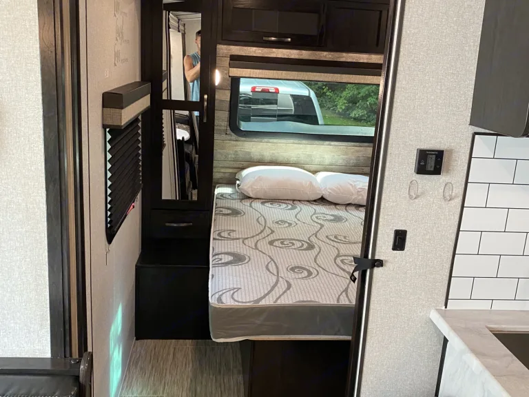 2020 Surveyor stocked with plates,cups, coffee mugs, utensils ,coffee maker ,pots and pans and K cup coffee maker. Separate bedroom with a queen bed with door Entrance to the outside. Lots of storage .18 foot Retractable awning with LED lights. All you really need is linens , towels and food and it’s ready to make memories.