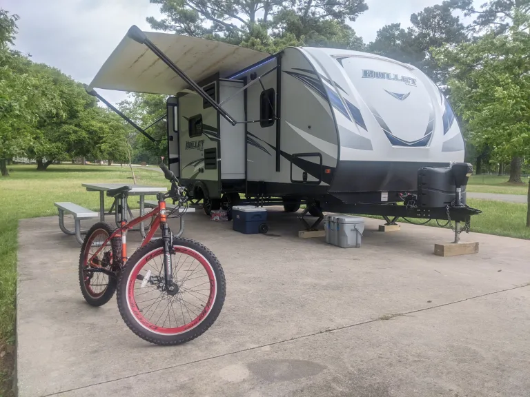 2018 Bullet by Keystone 26' camper with dual slideouts. It features a queen-size bed up front, dinette that converts into a twin-size bed, pivoting TV screen, Bluetooth compatible indoor & outdoor speakers, refrigerator, stove-top, oven, microwave, sink with removable flat top, indoor & outdoor showers, commode, wardrobe closet, heater, Air Conditioning, awning over door and patio area.What's included(2) camp chairs, basic cooking utensils, clean linens and towels, Hammock, Outdoor carpet for under the awning.