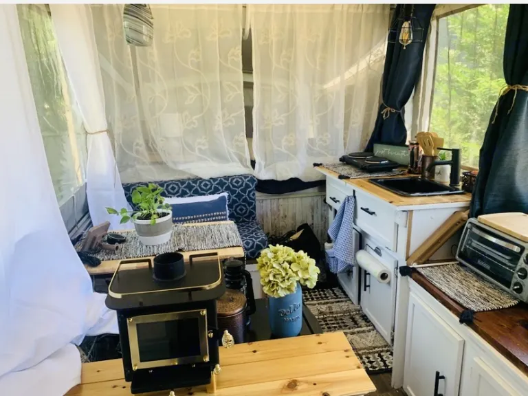 The mobile Zen Den! Completely renovated with upgraded finishes and premium bedding. All seat covers are water resistant and washable, so feel free to bring your furry friends along. The two pendant lights have their own mini solar panels. The inside cooktop, mini refrigerator and toaster oven can run off solar, 110 volt, 30 amp or 50 amp depending on where you are staying. The air conditioning is ice cold! It must be plugged to shore power to be used (it needs at least 2200 watts to run, so it will not run off solar). Outside shower and toilet setup. Joolca shower runs off propane. King size beds on both bunks. Due to the remodel, the bench seats are no longer able to be made into beds, so its best for a max of 4 people. What's includedLinens, camping chairs, outside toilet and shower. Other things to notePlease no gas cooking inside the camper. It’s causes a lot of moisture. To use the air, you must be connected to 110v, 30amp or 50amp (adapters included).
