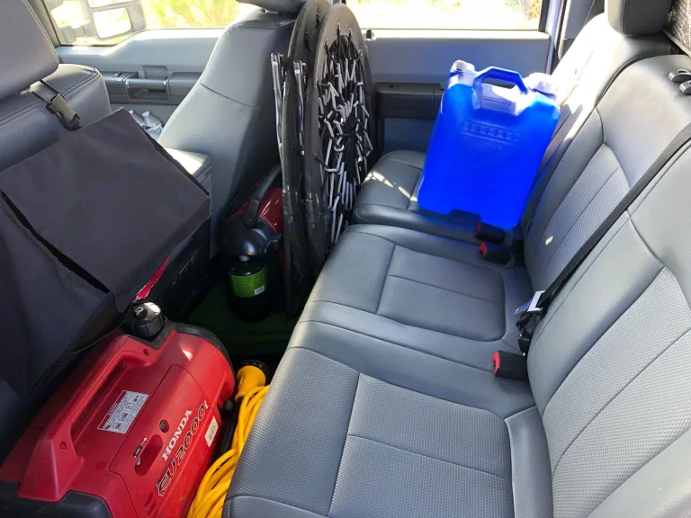 Whether you're heading into the great outdoors (or traveling into interstellar space), this thing is stocked and ready for action!What's includedThe back seat of the truck will be stocked with some outdoor gear including a mat, camp chairs, 7 gallon water jug plus plenty of room for people or bags. All of these items may be moved into the camper when traveling to allow more room while traveling.