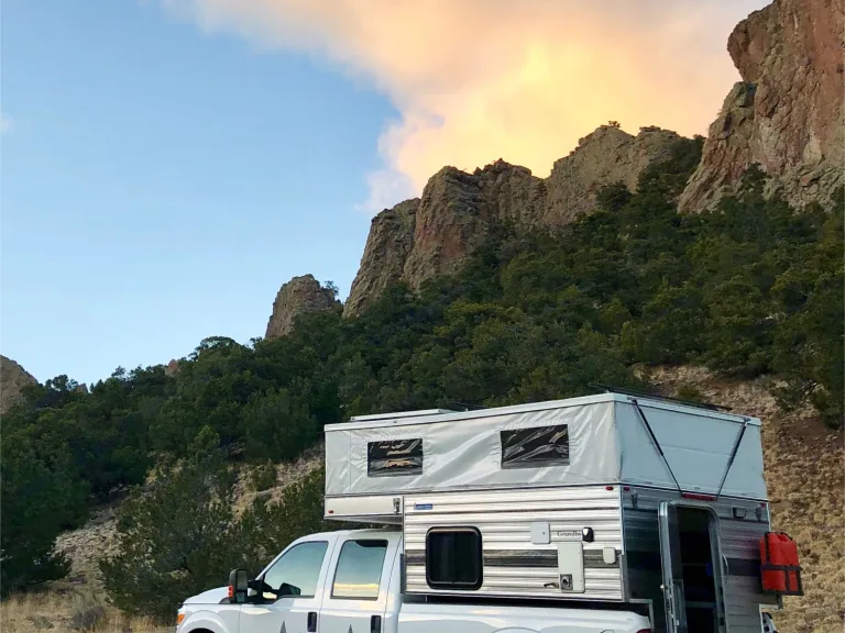 The Four Wheel Granby camper sleeps four people with a queen bed and a dinette that turns into a full size bed. The camper has the following features: