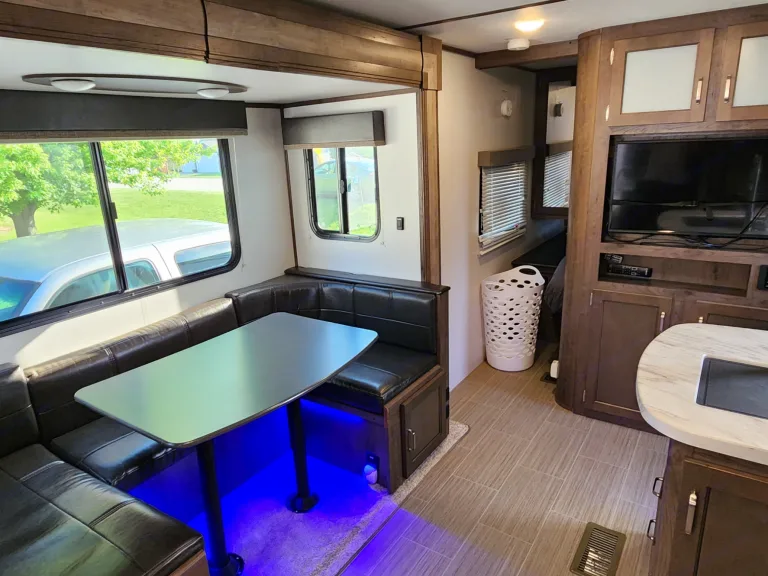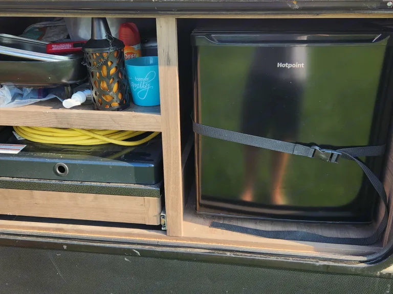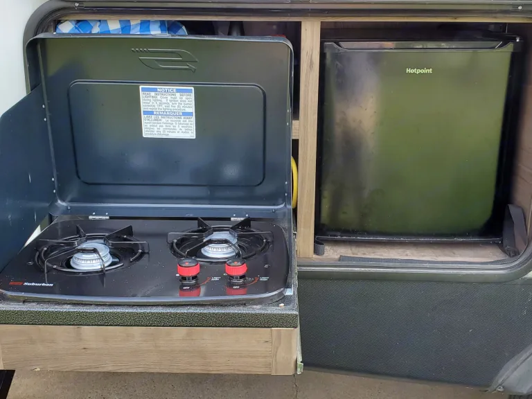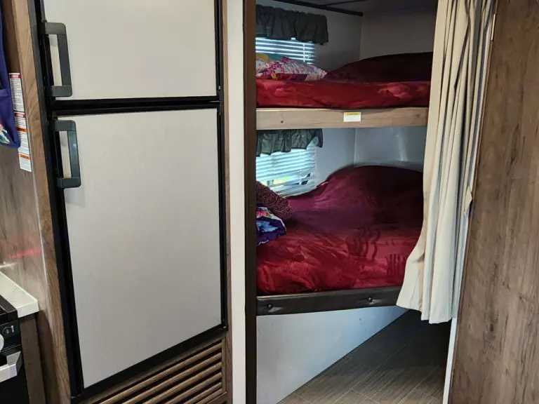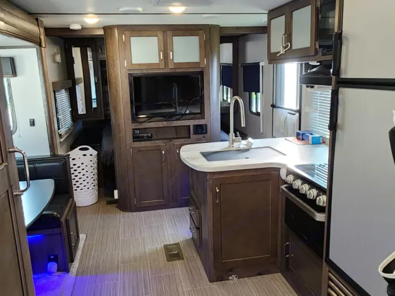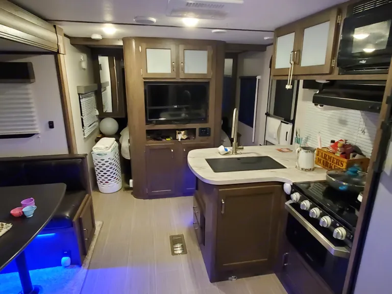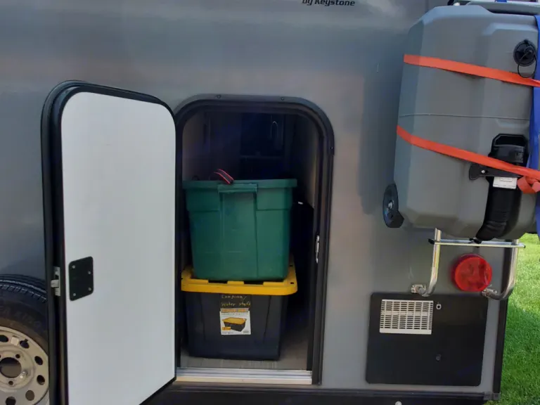 OCD clean!! Trailer A frame on front for extra travel storage or optional generator. Additional storage inside with the rear door for long items or adventure gear. Memory foam topper on Queen bed. Electric stabalizing supports. Electric jack and awning. Outside kitchen with mini fridge.What's included2x folding patio chairs, camping table, linens, cookware, utensils.