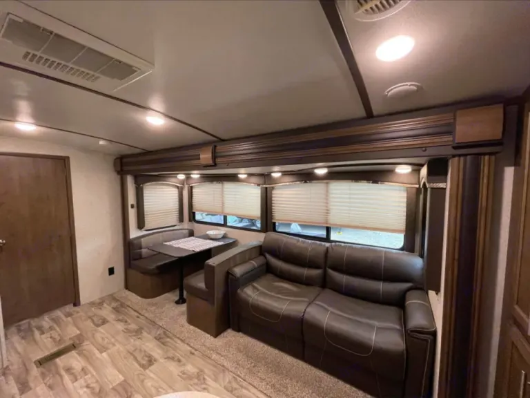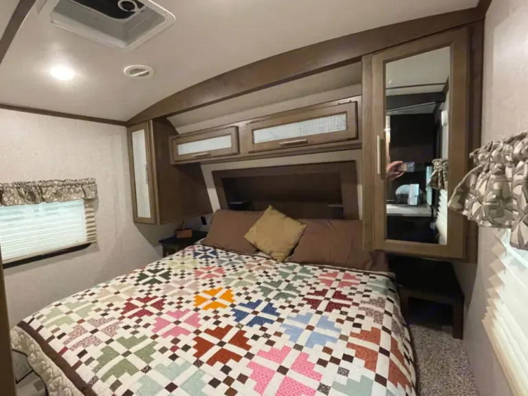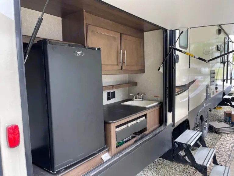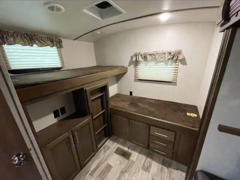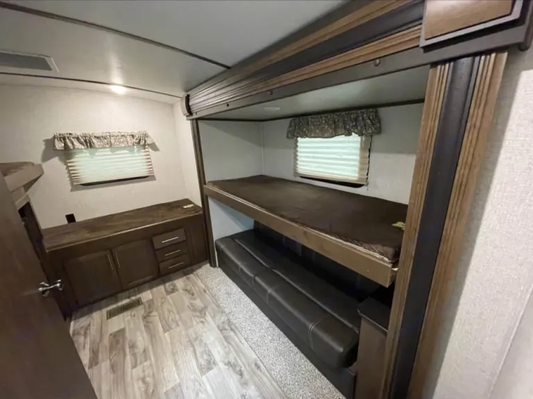 This half ton truck towable camper is a must for a bigger family. Featuring a separate bunk house in the back for all the kids. What more could you want than an outdoor kitchen? Well it’s got one including a mini fridge and sink with hot water. Also an outdoor shower hose with hot water to rinse off the days adventures. Bring your whole family along for this spacious 2 slide outs summer fun house. What's included• 2” stabilizer hitch with bars
