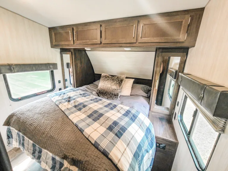We are not a petite family ladies and gents! We like to eat! That’s why so much attention was paid to making sure the camper we decided on could keep up with the amount of cooking we do… especially while traveling! There is a NON-Camper Size fridge with plenty of room to stock up for the week, a gas range in the kitchen, Huge stainless sink and a microwave/ convection oven that has blown my mind (Seriously… the thing does Everything!) in the kitchen Plus we keep a propane grill in the exterior storage ready for steak nights!