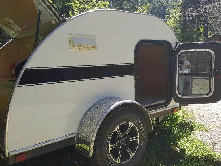 The Falcon Getaway Teardrop is sparkling clean, stylish, well outfitted and comfortable. This classic beauty has a comfortable queen bed and a galley kitchen. At 900 pounds, this camper is light enough for most any vehicle to tow with a 2" trailer ball and no trailer brakes are required.Included: Queen bed, Galley with Gas 2-burner LP Cooktop, Full Propane Tank, Stainless Sink with 7 gallons of water, Ice Chest, 12-Volt Electrical System, Power Vent, Interior/Exterior Lights. Electrical Trailer Hookup for 4 Wire Flat or 7 Way-round plug. Kitchen Utensils, Corkscrew, Pots and Pans, Dishes, Cutting Board, Cutlery, and Drinkware for four. Two Camp Chairs, flashlight, and Fire Extinguisher.What you will need: Your pillows and linens. A two-inch trailer ball and a trailer brake light plug.Location: Conveniently located in Nevada City at the north intersection of Highway 49 and Highway 20. Nevada City stands at the gateway to Tahoe National Forest and Downeyville Lakes Basin area which offers numerous camping opportunities. Campers wishing to stay close to town should check with the InnTown Campground, Nevada County Fairgrounds, Scotts Flat Lake or Rollins Lake.