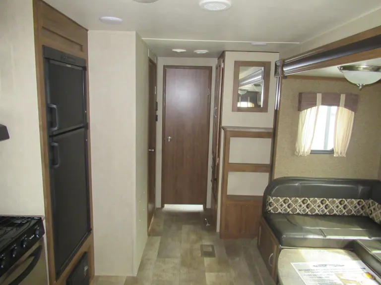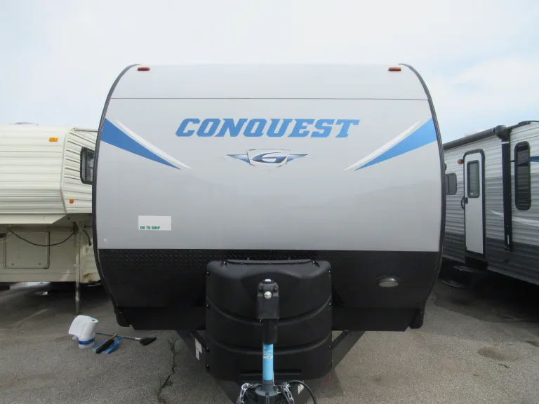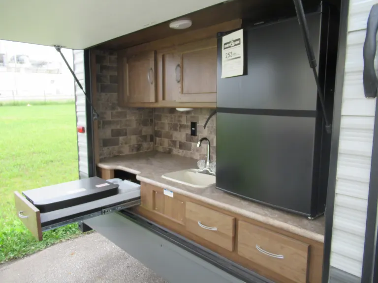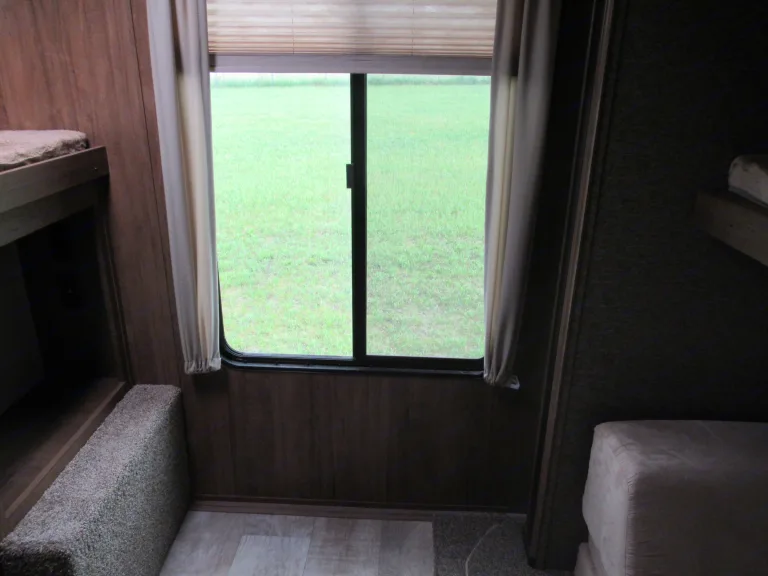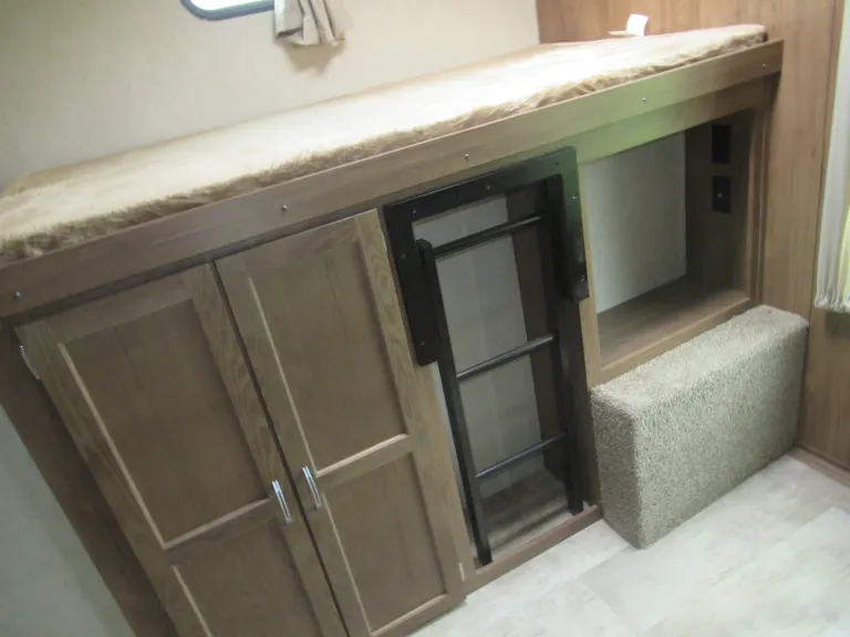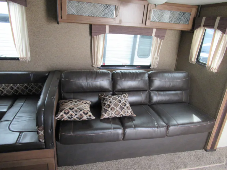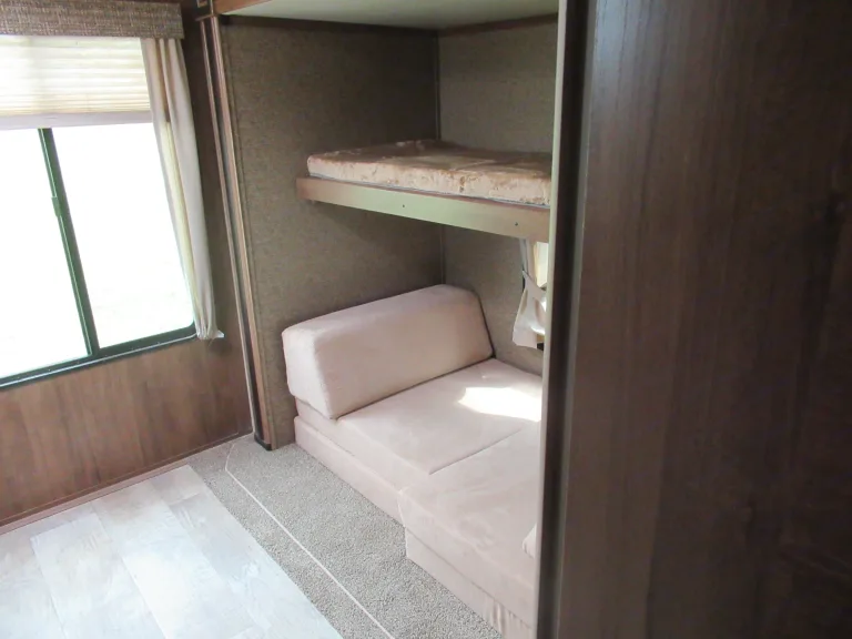 Features a power tongue jack for simple set up. This is a nice large unit for a medium to large family. Table and couch fold down to make more beds on top of the three bunks in the front. Has a full restroom and A/C. Equipment included: Water hose, water regulator, 2 wheel chocks, 10 leveling blocks, electrical adapter, propane gauge. Slide outs makes the camper appear large.