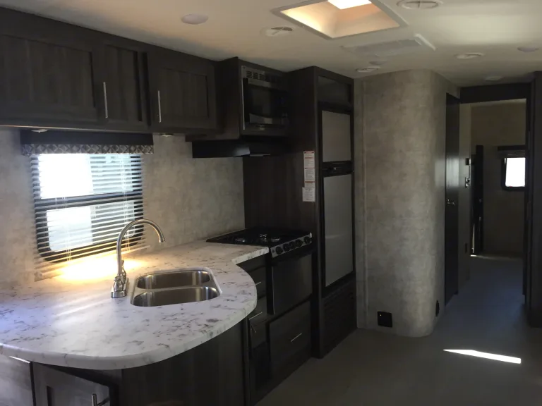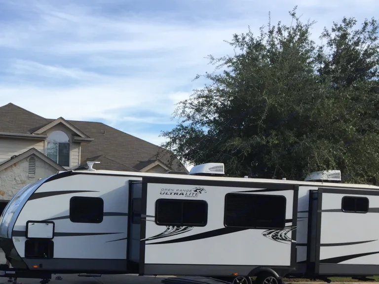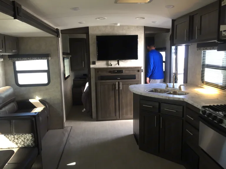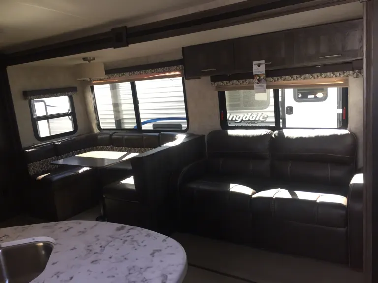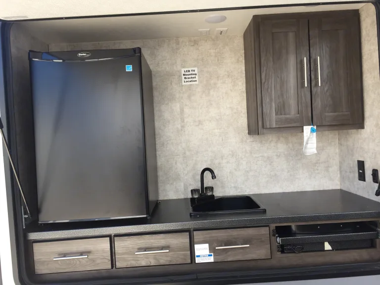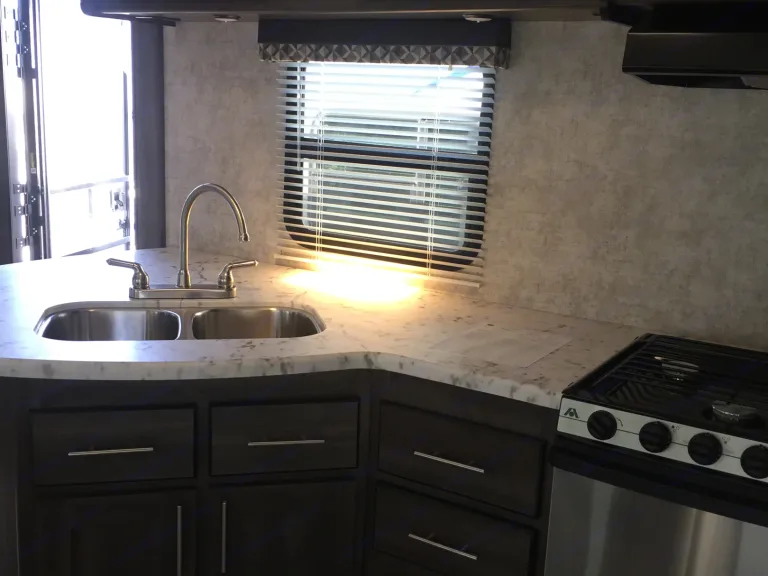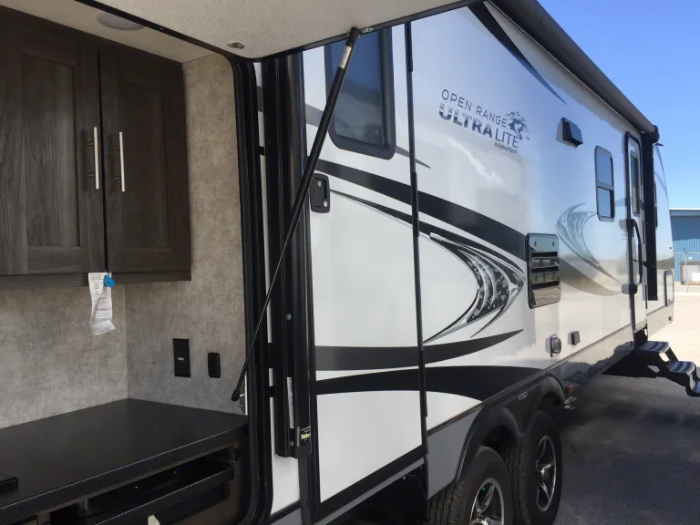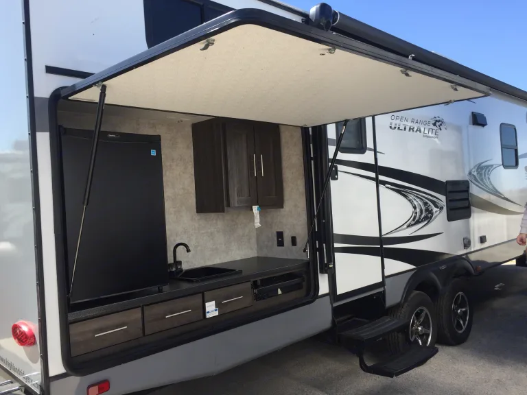 With our 2017 beautiful open range you can sleep up to 10people. There is a bunk house in the rear for the kids to sleep or play games. The private master bedroom has a queen size bed and storage all around. Doors close on both sides for your private separate bedroom. The living space has a couch and table that both turn into beds with a flat screen Tv and DVD player for your enjoyment. Restroom facilities come with bathtub/shower, sink and toilet. It is a 50amp trailer but we can provide a 30amp adapter. Trailer has two slides and is 34ft long and has plenty of room for all your needs! With a ton of storage and space for guest the inside of our camper will make your trip relaxed and comfortable. We also have two ac units to keep you and your guest comfortable in this Texas heat! When your outside enjoying the fun of camping we also have a full size out door kitchen with a cooktop,