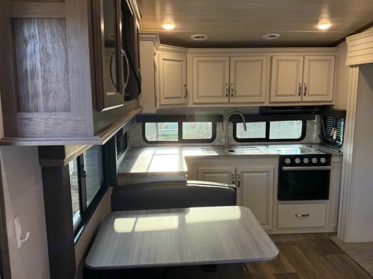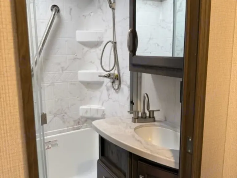 If you are looking for a fifth wheel with inside and outside cooking then check this unit out! This unit offers a short, mid-living layout with a bedroom wardrobe slide and combined 12 volt refrigerator and theater seating slide for added floorspace to move about. Up front, you will enjoy a private bedroom with a queen bed and bedside wardrobe/nightstands as well as a larger wardrobe that slides out along the curbside wall. A complete bath provides a large shower, toilet and sink, plus linen storage which you are sure to appreciate as you travel. If you enjoy spending time outdoors, imagine making breakfast for your friends and family using the outside griddle. There is also a 16' awning to create even more living space to enjoy, and the unobstructed pass-through storage compartment can easily house all of your outdoor camping gear like lawn chairs and yard games.