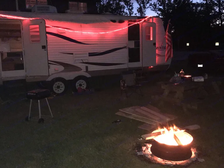 Has one slide out, also keep a charcoal grill on board with charcoal, rv mat, also four tiki torches with fuel