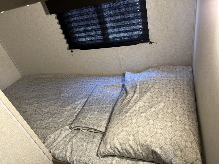 To cook: kitchen with a two burner stove, sink, full size 12V refrigerator, microwave and a coffee maker for that morning coffee. It’s also equipped with pots, pans, plates, bowls, mugs, utensils and spices.