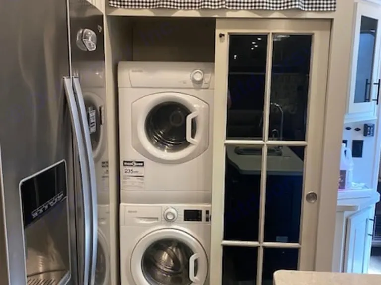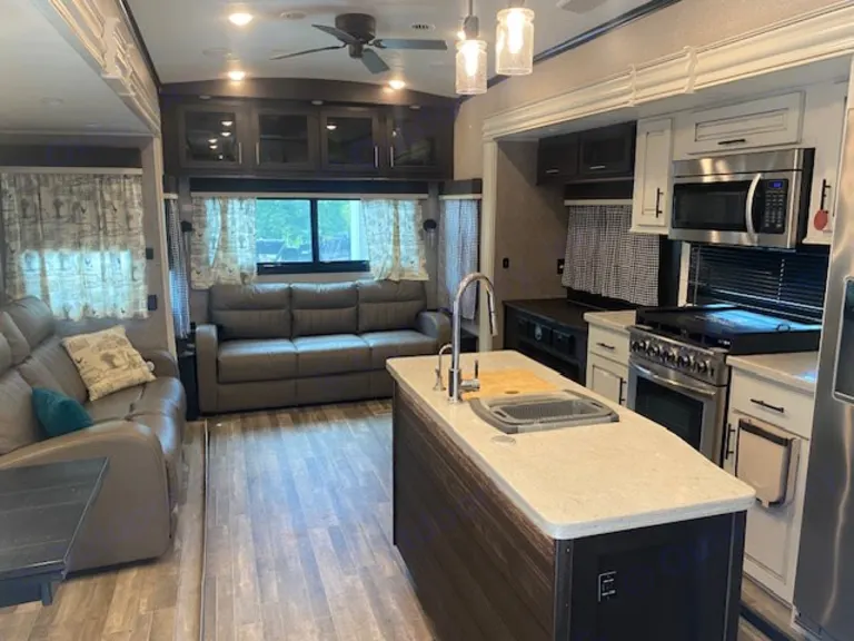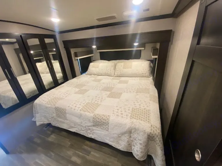 Step inside and be blown away by the spacious and comfortable living area. The RV is stocked with plush seating, a flat-screen TV, and a dining table perfect for dining or playing games with family and friends. The kitchen is fully equipped with all the conveniences of home, including a refrigerator, microwave, stove, and oven.