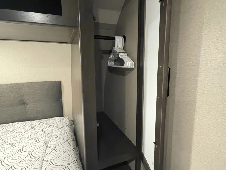 The bunkhouse features 2 sets of bunks with a TON of storage for clothes and a TV!