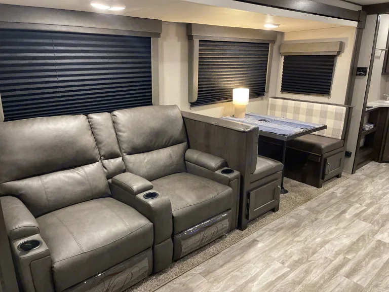 The living area features a Roku TV that turns and swivels for your comfort. Our beautiful leather reclining chairs are SO comfortable!! Perfect for a good movie night! Our dinette area turns into a sleeping area as well!The outdoor area has an outdoor cooking space with a second fridge! The speakers and awning provide a wonderful environment for those campfire nights! We have an outdoor hose to make life easier on the road as well.We hope that you will consider our lovely Dorah for your next family camping trip or vacation! We can't Wait to hear about your travels and adventures!