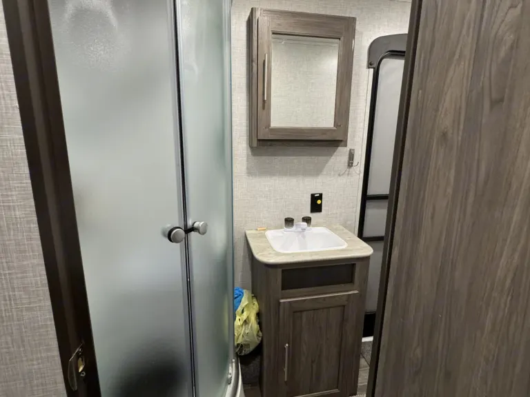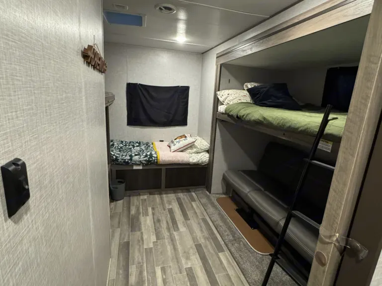 The bunkhouse is a favorite for kids and teens, offering three bunks plus a fold-down couch that converts into an additional sleeping area. It also includes a small eating or game space and a door for added privacy.All beds come ready for you with fresh linens and pillows for a restful night’s sleep.Bathroom Essentials Included