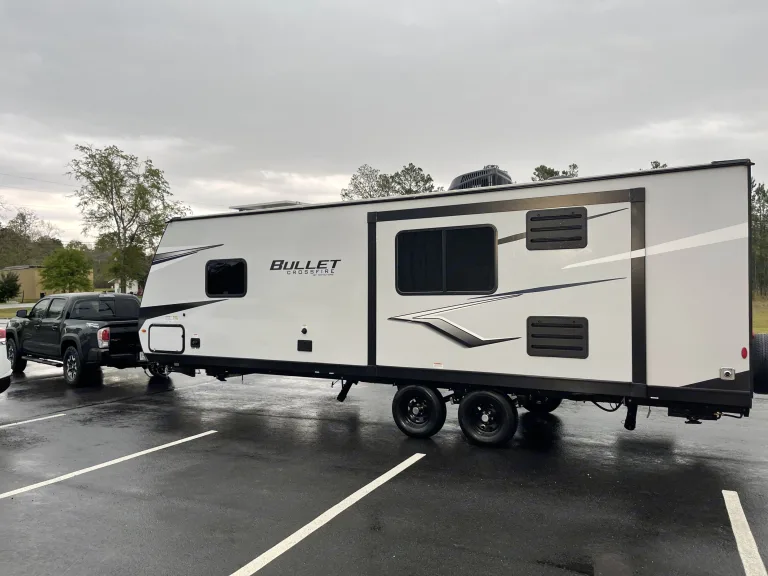 2022 Keystone Bullet Crossfire with a modern twist on camping. Some may call this glamping! Featuring a comfy queen size bed, spacious private bathroom with lots of storage. Camper has Cold A/C unit or if it’s a bit chilly outside turn on the heat! There’s room for your family and friends, sleeps up to 6 including a queen size bed, full size pull out couch and dinette that converts into a twin. This camper includes a spacious kitchen with microwave, oven, and refrigerator, but if it’s a beautiful day outside… enjoy the black stone table top griddle, Coleman stove, 2 out door chairs, and a long outdoor table all under a spacious awning with LED lights and an outdoor speaker system. What's includedIncluded: 2 camping chairs, outdoor rug, outdoor shower hookup, Coleman stove, s’mores sticks, outdoor table, fresh linen upon request, Keurig with coffee pods, one complimentary roll of paper towels and toilet paper. All kitchen essentials are included and are welcomed to be used. RecommendationsWe’ll deliver for a small delivery/set up fee to all local camping spots up to 60 miles including: Blue Springs, Otter Springs, Hart Springs, Gennie Springs. The Santa Fe River, Ocean Pond or other local camping locations. Also great for tailgating for gator football season! Pick up also available! Monthly rental available as well for travel nurses or part time local workers! Camper weight is 5,630 lbs!Other things to noteSmall pets welcome!