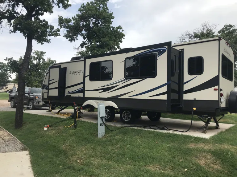 **Delivery option is for anyone that wants to enjoy camping in comfort but may not have the capability to tow a camper to their favorite campsite** We will do it all for you, drive it, deliver it, set everything up for you, then return to close up camp and you get to drive home, no effort no worries, you get to enjoy camping without any of the hassle of set up and tear down. This camper is 50 AMP, Sleeps 6, 4 adults, 2 kids. Beautiful Rear living with fireplace, full length couch, two reclining stadium leather chairs, TV, stero with surround/indoor/outdoor speakers. Lots of Windows. Dinette booth table, island sink, stove, microwave, oven, larger fridge. Queen bedroom with tv. Full shower, porcelain toilet in bathroom. Two AC units for comfort, one in living area, one in bedroom. Two Awnings with outdoor lighting, outdoor kitchen with mini fridge, sink, stove and indoor TV swivels for outdoor entertainment. A beautiful comfortable camper that will not