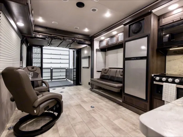 There is 16'6' of open living space with extra high ceilings giving you plenty of room for your family and friends! The full-sized rear ramp door doubles as a patio. Lounge on the patio in the euro chairs enjoying the sunset or watching the stars. One couple used the rear patio to set up movie night under the stars with their kids! You have to stay fed to keep the fun going so choose between using the inside kitchen amenities or outside kitchen, the choice is yours! You will have three sofas (1 pullout) and two Euro chairs to relax on as well as a Happi-Jac power bunk that makes 2 queen beds plus the queen bed in the master bedroom when it's time to sleep.Master bedroom has a walk around residential Queen size bed with tons of countertop space, huge backlit make up mirror, and walk-in ensuite off the master bathroom.