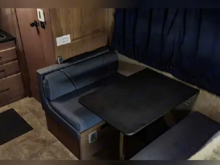 The cozy interior includes a full kitchen, comfortable sleeping for up to four, and a full bathroom, ensuring you have all the comforts of home wherever your journey takes you.