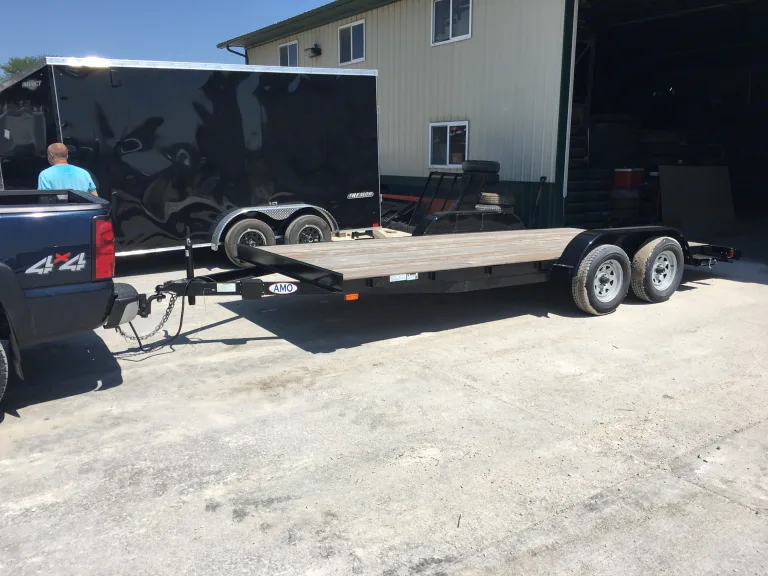18ft open car hauler. Dual axle. Brakes on both axles. 7000lb weight limit.