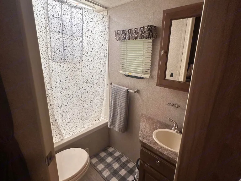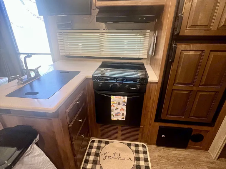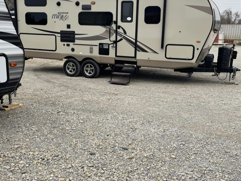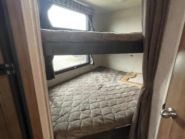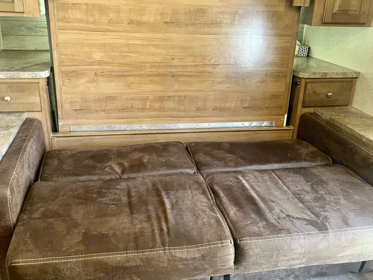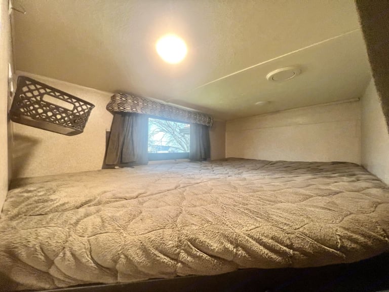 Cozy camper for a family getaway! Sleeps 8ish. Has super comfy couch with Murphy bed that is memory foam and charging ports and mini closets on each side! Also, a curtain to separate and make a “bedroom” out of it. Full kitchen(oven, 3 burner stove top, freezer, refrigerator and microwave. Big double sink with cutting board cover, and coffee maker. Full bath with spacious skylight standing shower. 32” TV(that is mounted where it can connect to the mount outside as well) indoor/outdoor speakers. Super comfortable huge bunk beds with a curtain in front as well to let kids sleep in private. Also charging ports to charge tablets and mini lights for reading! Outdoor kitchen and shower. Power awning with LED lights for late nights. Pre-loaded s’mores kit, bottled water, and snacks in the pantry are all yours for the taking! Kids tote with coloring books, DVDs and games available for use! Comes with utensils, plates, cups, napkins, paper towels and trash bags. We do have some cookware you are more than welcome to use! Fresh linens provided as well(towels, sheets, and comforter). We are very flexible with times to pick up or drop off. Also willing to deliver/pickup within 60 miles for extra charge! If more than 60 miles, message us! As always, If any questions feel free to message! We are here to help you enjoy your home away from home! We work until 5:00 Monday thru Friday and the soonest for pickup/delivery would be 5. If needing sooner, we try and work diff times out, just message me!What's includedPre loaded s’mores kit, bottled water, coffee and snacks in pantry all yours for the taking! Also have cookware you are more than welcome to use, grilling utensils, and disposable utensils. Kids tote of coloring books and toys available. Playing cards and a couple games also available for your use! Fresh linens (sheets, towels, and comforter)Other things to noteWe just ask please no smoking inside as we have children. Also, unfortunately, no pets.