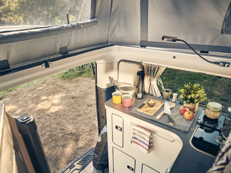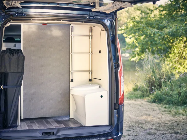 A la différence du Nugget, la version Plus libère une zone arrière abritant un WC fixe, protégé par un panneau rétractable, et un lavabo escamotable pour que les utilisateurs n’aient pas besoin d’utiliser l’évier de la kitchenette pour se laver les mains ou se brosser les dents.