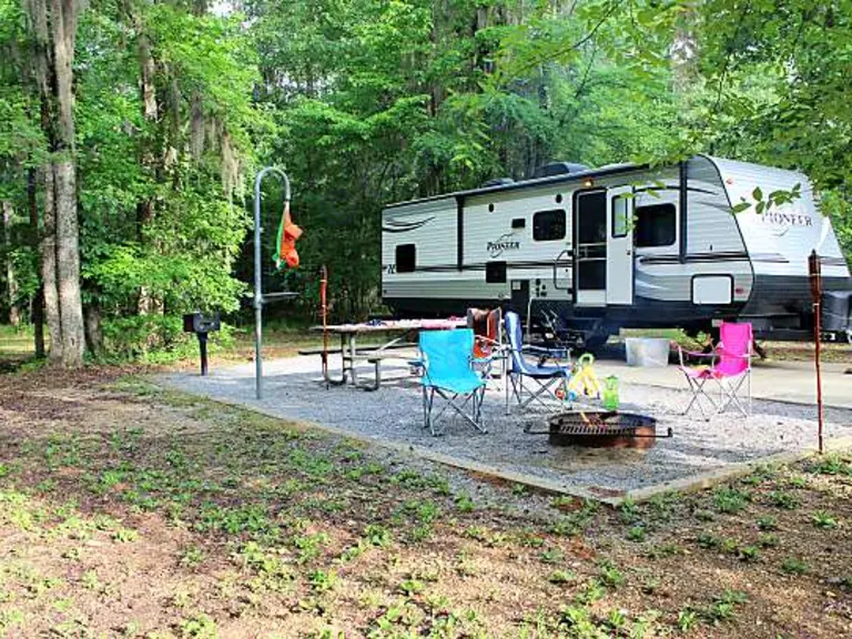This beautiful, new, spacious travel trailer sleeps 8 comfortably and if needed, a total of 10! It is equipped with a refrigerator, freezer, microwave, gas oven, double sink, indoor/outdoor showers, and bumper bike rack. It's a bunkhouse, meaning the back bedroom has twin size bunks on both sides. It has heating and A/C making it perfect for any time of year.