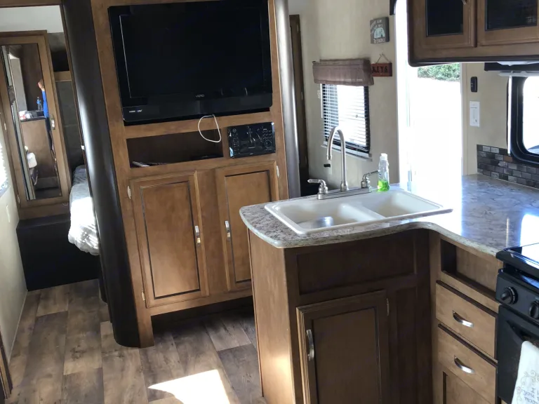 Our trailer includes a private queen size bed with tv/dvd combo. Kitchen area has a u-shaped dinette that also converts into a full size bed as well as the couch also converts to a full size bed. There is a 32 inch tv in living room and a large slide out that gives you plenty of room for a family. Built in dvd/cd player in living room and surround sound with indoor and outdoor speaker options. Electric awning