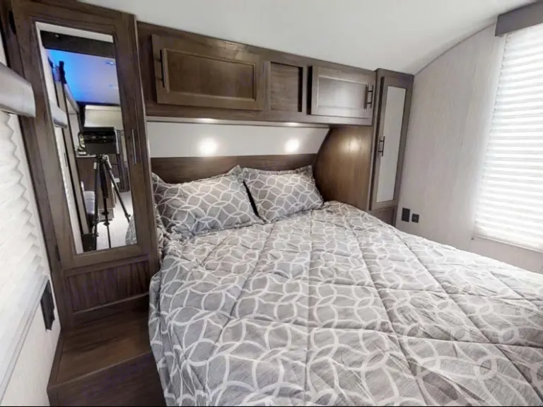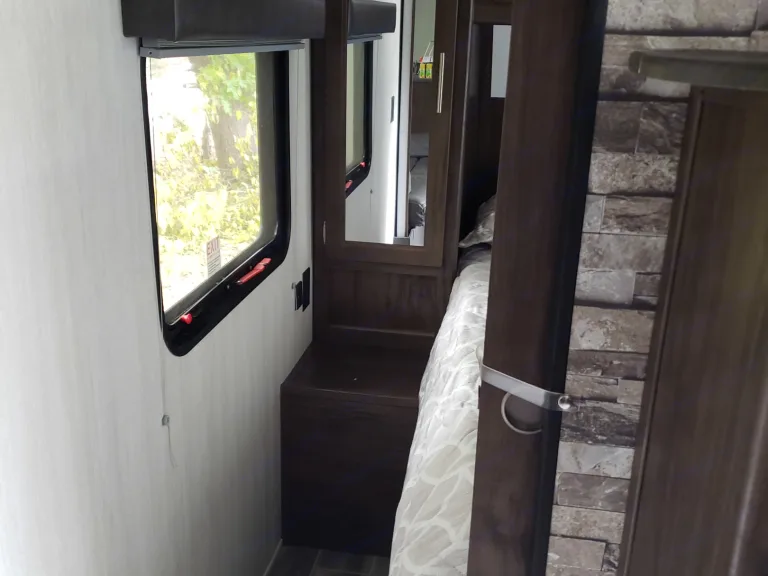 -Front bedroom has dual wardrobes Plus a bonus closet for extra storage. Unlike most campers The Wolfs main bed has been fitted with a 4 inch memory foam topper for your sleeping comfort! The mattress is covered in a comfortable “Safe Rest” 100% water proof, hypo allergenic cover that resists bacteria and dust mites.