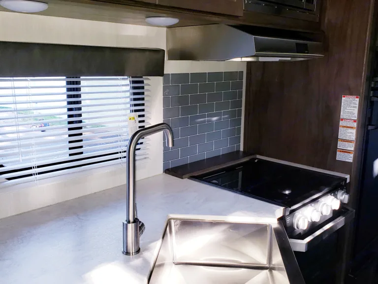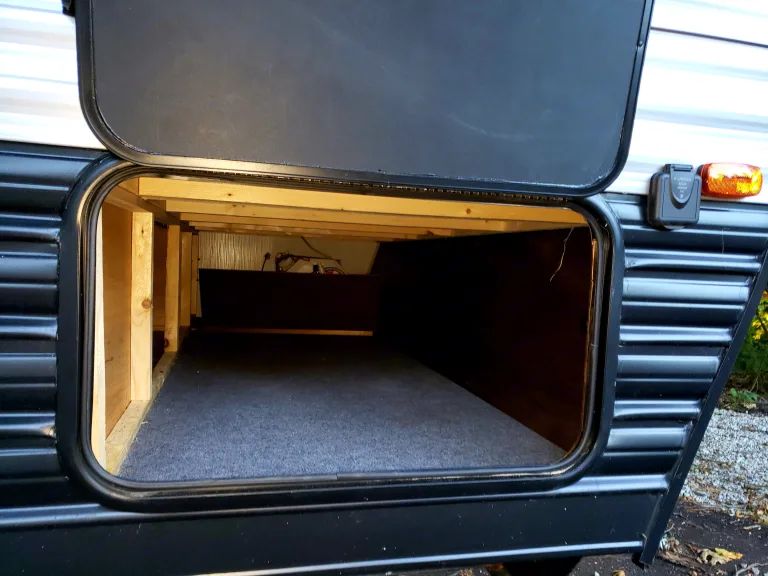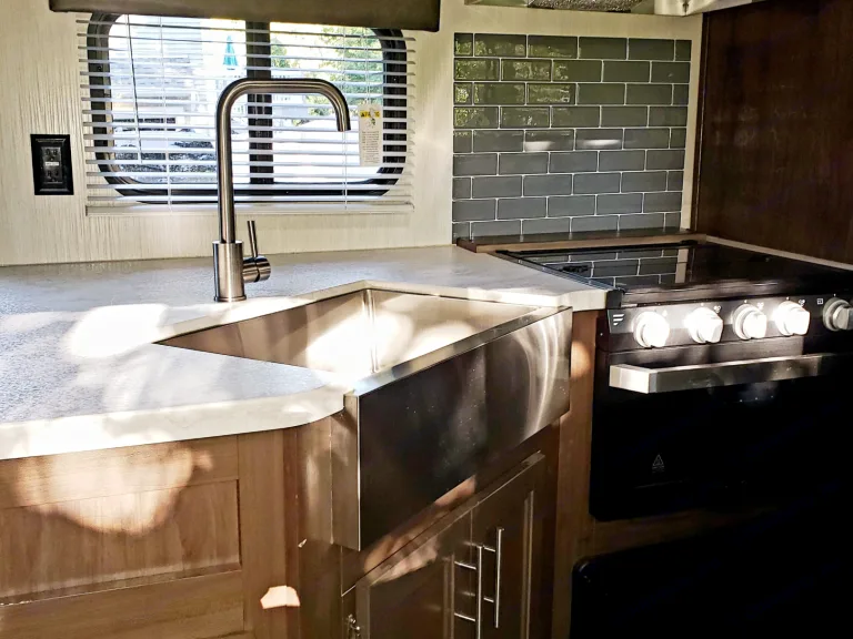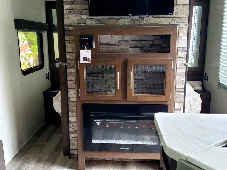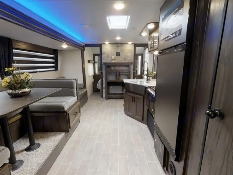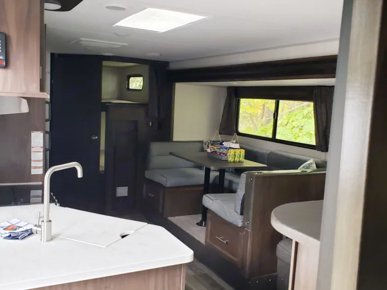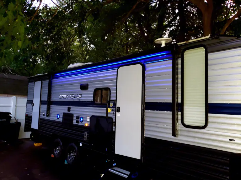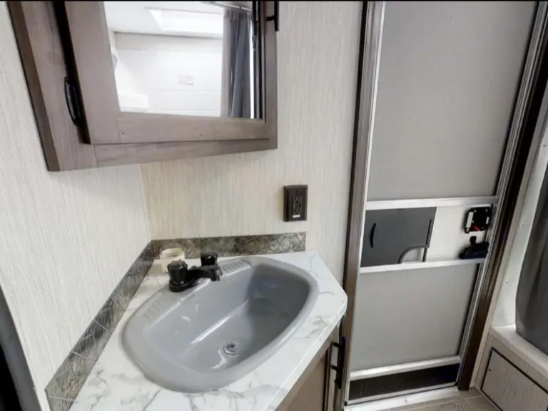-2nd entry leads directly to bathroom (stocked with hand soap, RV toilet paper, and hand towels) so campers don't need to trek through your home away from home to get to the bathroom. -Exterior of camper has Cherokee camp kitchen (grill, fridge, and even an ice maker!) along with outdoor hot and cold shower.