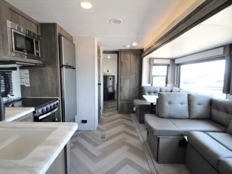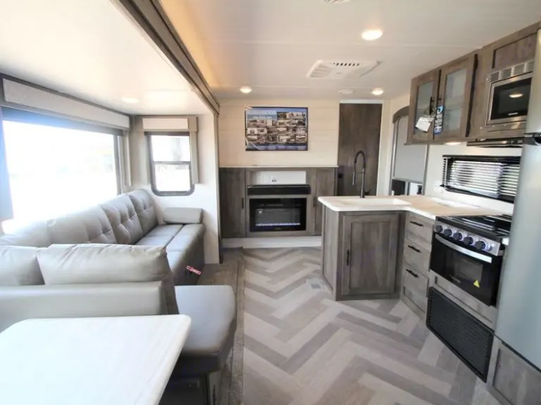 Our brand new 2021 travel trailer is ready for you to hit the road to make memories!This Travel Trailer is great for camping trips and long-distance travels. You can enjoy the shade and comfort of the 18' patio awning for more time outside. A family of 9 can sleep comfortably inside, and the master bedroom features a queen bed and a bunk room for the kiddos!The travel trailer is modern with hardwood, gray accents, a built-in outdoor kitchen, and is sparkling clean.You'll have plenty of freshwater for cooking, cleaning, and drinking, thanks to the 39-gallon freshwater tank in this great camper! Make home-cooked meals on the road in the modern kitchen, which has a 11.00 cu. ft. refrigerator, 3 burner range, and more! Enjoy dinner without even stepping into the RV using the outdoor kitchen!Whether you're a family or group of friends it's the perfect camper to take out and about.Scroll through the photos to see lots of sleeping areas, versatile seating, heating and air conditioning, generator and all the gear you need.Guests need to provide their own bedding, pillows, and towels.What's included• Kitchen pan