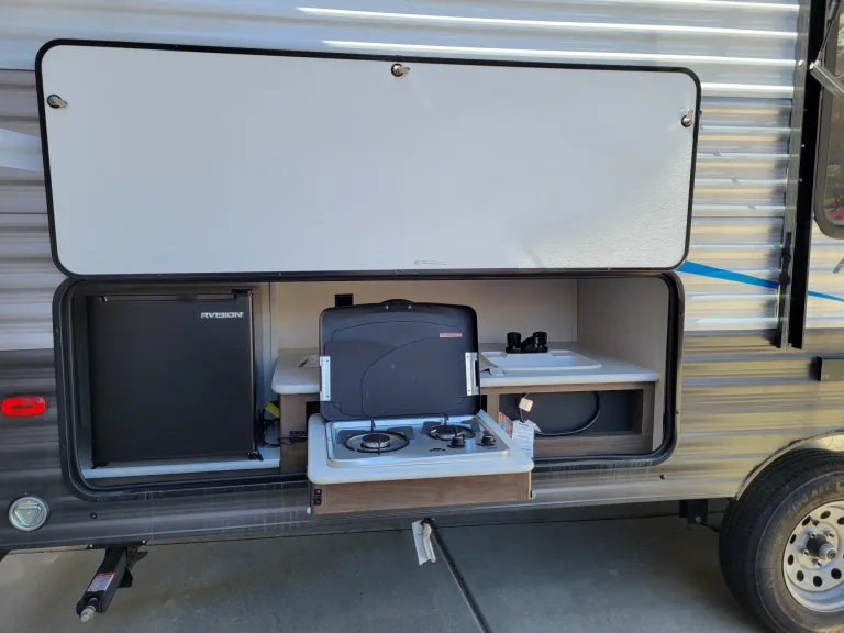 We have loved this beautiful, new and clean half-ton towable 2021 Travel Trailer. In fact, she has a nickname, Gypsy!Gypsy is complete with private master, full bunks, fully stocked indoor kitchen with all electric Residential refrigerator, ice maker, outdoor kitchen, 2 wall mount TVs, AC, Heat with Arctic pkg, separate bathroom shower/sink, Back-Up camera, outside shower, all hoses/connectors included, x chocks, stabilizing blocks, automatic leveler, leveling blocks, water filtration, 30A surge protector, and adaptor.Everything for your family to make wonderful vacation memories! We are centrally located half-way between West Yellowstone and Moab! Enjoy glamping in style and comfort!26ft trailer, excellent condition. 2 full bunks, queen. Also a Jack knife sofa bed and table bed for 5' and under. Outdoor kitchen with fridge, stove, and sink. No generator. In order to secure the rental, it is required that all renters sign our supplemental renters agreement (SRA).What's includedCamp chairs, hiking poles, fan, outdoor rug, hoses, electric surge protector, coffee pot, ice maker, utensils, plates, vacuum stick are included. Power awning provides great shade in the summer! Fresh linens are included in the add-ons.** Fresh water tank 42 gallons avail to be filled before pick up by request only (additional fee available in add-ons). If you don't want the weight while traveling, feel free to fill up closer to your destination.**Black and Grey tanks partially filled and ready with pretreatment for your worry-free dumping. Both 34 gallons. Please return emptied and flushed or fee is added, see add-ons.**Fresh linens included in add-ons upon request.**Generator is not included but feel free to bring your own!RecommendationsUtah has numerous RV parks, reservoirs, hot springs and federal land to Boondock. The Mighty 5 National Parks: Zion, Arches, Bryce Canyon, Capitol Reef, and Canyonlands are a must see. West Yellowstone and the Black Hills/Badlands in South Dakota are also a favorite!Other things to noteNo Smoking, Vaping, or Pets. We take pride in our Gypsy and want her returned smelling fresh!