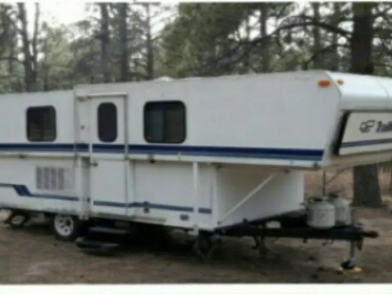 This is a very unique bi-fold, hardsided pop up camper. It has new laminate flooring. The camper shows signs of age but is in decent condition.- It is equipped with 1 queen bed in back bedroom and 2 full beds in the front of the trailer-1 of them being a booth that transforms into a bed.- There is a bathroom containing a tub/shower, recirculating toilet, sink & a bathroom exhaust fan- Camper contains & includes use of a portable rechargeable outdoor shower with suction mount or hook mount for hanging on tree branches, etc.- Galley kitchen with stovetop/oven, 3-way refrigerator, double sink and plenty of dishes and storage make preparing your favorite camping dishes a breeze- This is a very lightweight trailer & can be pulled by most pickup trucks and SUV's- Tires and spare tire all in great shape- Camper contains & includes use of lawn games such as horseshoes, frisbee, badminton, volleyball & net.- Camper contains a 19" flatscreen television, a HD antenna and a DVD player for those rainy days- Camper has a window AC for those hot days- All windows and screens in working order and there are 2 roof vents, 1 of the vents containing an exhaust fan
