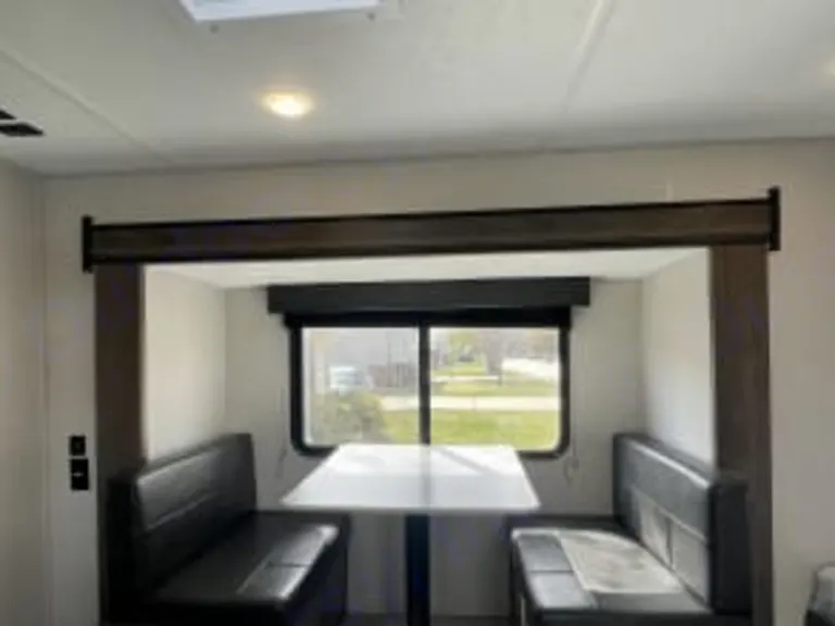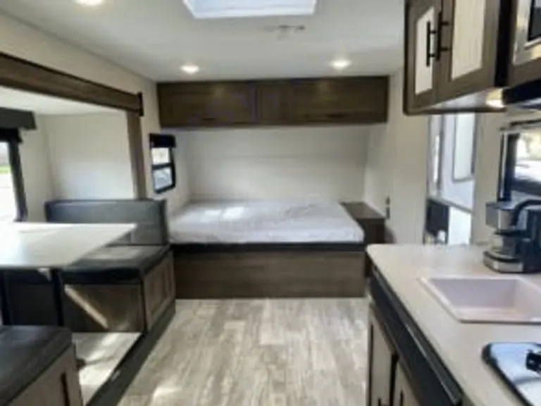 The kids will love the bunk beds, and you'll appreciate the front bed with a night stand for your valuables. The dinette slide also allows plenty of room for the kids to play games or just unwind from a day of swimming, hiking or biking. You'll be delighted with the kitchen skylight that gives natural light as you cook a meal for your family. The LED-lit power awning and outdoor speakers allow you to enjoy those evenings with loved ones as you dream around the campfire. Relax in style and comfort with this travel trailer.What's includedCamper comes equipped with all items needed to tow the trailer - hitch, cord etc. also comes equipped with basic cleaning supplies, a broom/dust pain and hand held vacuum; eating utensils and cooking utensils, a basic set of small pots/pans, a coffee pot and dish soap and trash bags.