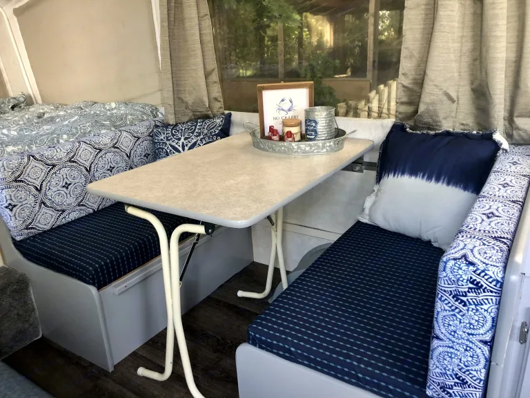 *** Unfortunately, we are not accepting any more rentals for the 2021 season at the moment. Thank you for your interest."Skipper" is a remodeled pop-up ready for fun! This camper has been freshly updated with new dinette cushions and sofa cover, wood-look flooring, and a clean modern paint job. Inside you will find one queen pop-out bunk, one double, and a jack-knife sofa and dinette that convert to sleeping areas. Lots of fun extras include nautical decor, throw pillows, lanterns, hanging fabric shelves, and coasters. Enjoy cool night breezes through the multitude of zippered windows available. If it gets too hot, the air conditioner will keep you comfortable all night long.Cooking outside? We provide a folding table, Coleman combination stove/grill, dishes for four, pots and pans, wash basin, dish drainer, coffeemaker, silverware, vinyl tablecloth, and cooking utensils. Also included with your rental are two folding camp chairs, small folding table, and outdoor rug. We provide some start-up cleaning supplies- paper towels, wipes, dish detergent, and a dish wipe.What you need to bring: bed linens or sleeping bags, towels, food, and small 1 lb. propane for the Coleman stove.
