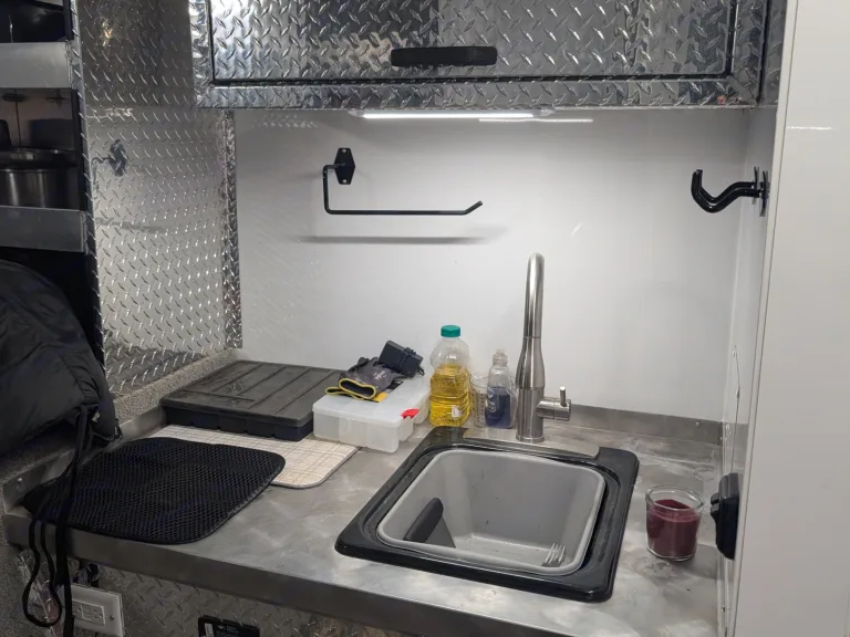 • watch what is put down the sink to the gray water tank. If possible please rinse into sink tub and dump it outside. This trailer does not have a garbage disposal and putting to much food waste down the gray water will cause it to smell bad. If possible just shower water and semi clean sink water.