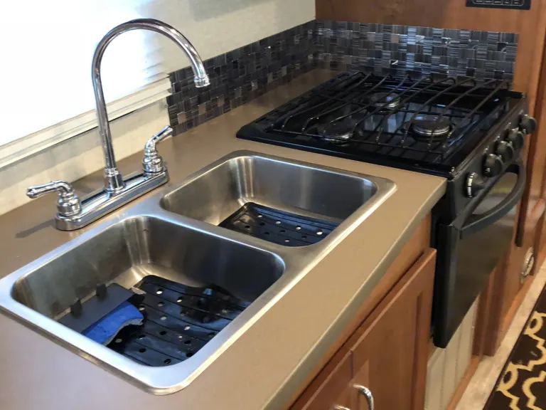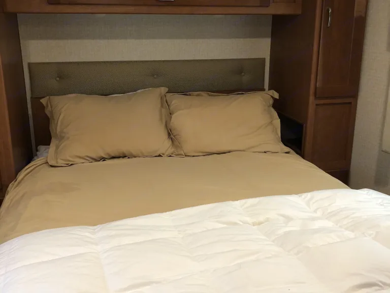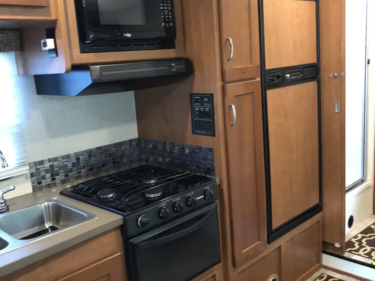 Above the cab seats there is also a 57" x 95" bunk that the kids will certainly enjoy.To the left of the main entry find a counter area, a double sink, three burner range, pantry, and refrigerator for all of your food prep and cooking needs.Next, a sliding door leads to the rear bedroom and bath that features a shower on the left and a private toilet area and vanity with sink on the right.The rear queen bed features a nightstand with shirt closet above on one side and a wardrobe opposite. There is also an overhead cabinet for additional storage, plus so much more!Included are kitchen sets and linens for each member traveling.What's includedGrill, camping chairs, bike rack, pots and pans, silverware and plates, coffee maker and toaster.