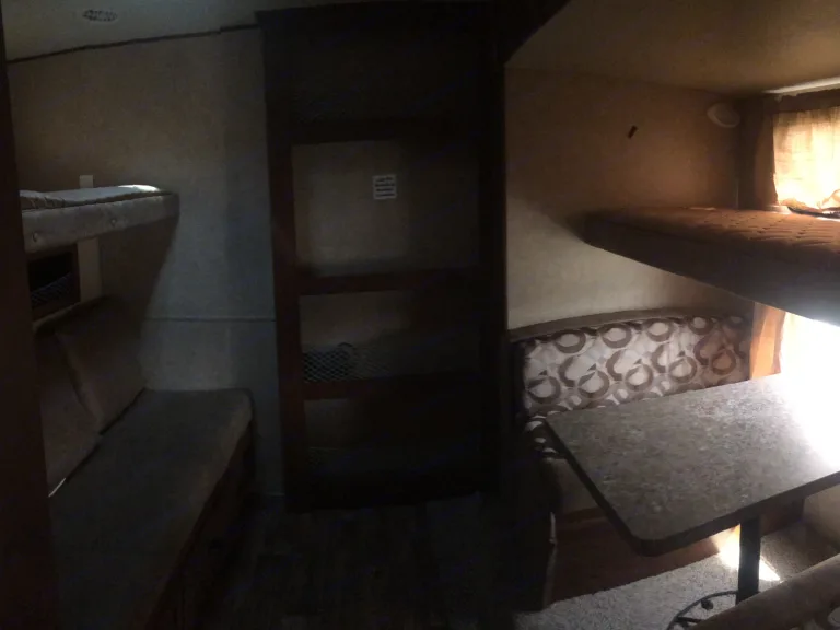 357sq feet! A beautiful, like new family and pet friendly RV with lots of extras is ready for your next adventure! Features include a private master bedroom, outdoor kitchen and 2 AC units. There is also a separate bunkhouse for the kids which includes 3 twin beds, AND a mini dinette that converts to a twin bed for a total of 4 bunks and plenty of storage space. The living room features a huge couch with optional tables for eating and games. The couch converts into a queen size comfortable, auto inflating air mattress.The outdoor kitchen includes a mini refrigerator, sink and slide out stovetop.Outfitted with all the supplies you need including table setting for 8, coffee maker, Pot & pans, mixing bowls, cooking utensils/serving utensils, broom & dust pan, garbage can, table cloths, games, sheets and limited towels. If you need anything else, let us know -we probably have it!We also offer delivery and set up for a fee.Lots OF Storage!