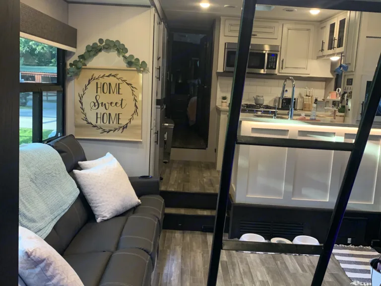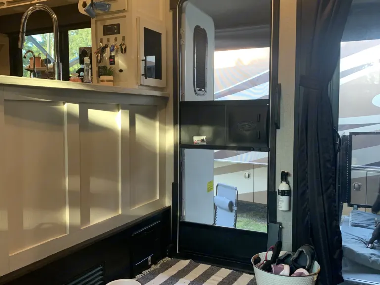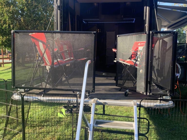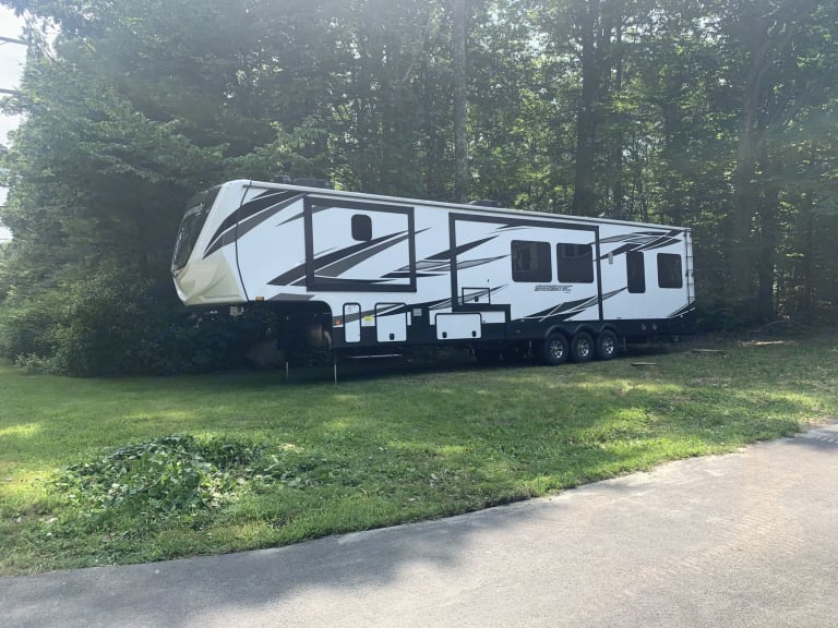 There are two decks on the rv. Perfect for sun gazing with the dogs or morning coffee and evening dining. The side deck even has a tv location, perfect for those by the campfire and deck to both enjoy the game/movie. There are 3 AC units on board and all electronics and awnings are controlled by the main control screen. The built in generator is also controlled through it as well. On those cold nights, there is a fireplace with heated and massaging chairs on the ends of the sofa. This has been a perfect set up for our family and friends, as well as puppies to enjoy. The farmhouse trim also makes the rv feel more like "home" than a hotel.This is a delivery only, as the weight and size of this rv is too large for the average truck to haul. What's includedRV will come with: